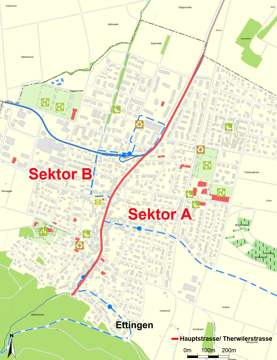 Für die Abfuhr von Papier und Karton ist weiterhin die H. Vogelsanger AG zuständig, jedoch wird hierfür eine Sektorentrennung eingeführt, wobei im Sektor A (östlich der Hauptstrasse / Therwilerstrasse) an jedem ersten Donnerstag im Monat und im Sektor B (westlich und einschliesslich der Hauptstrasse / Therwilerstrasse in beiden Fahrtrichtungen) an jedem ersten Freitag im Monat eingesammelt wird (siehe Plan Gebietsaufteilung - Papier- und Kartonsammlung).